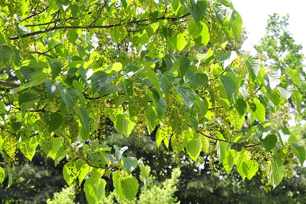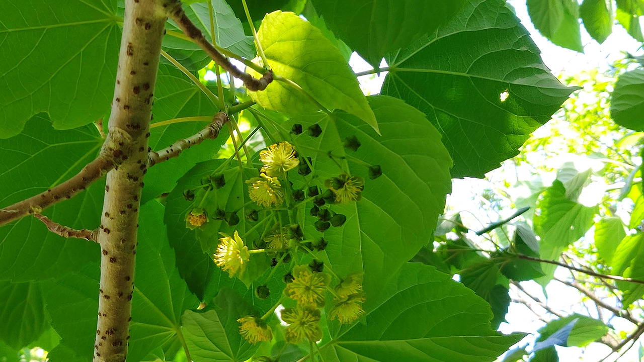 잎은 어긋나고 달걀 모양 심장형으로서 길이 10∼25cm, 나비 8∼20cm이다.