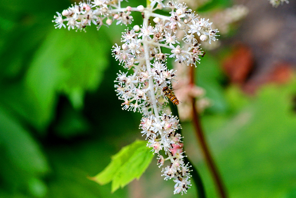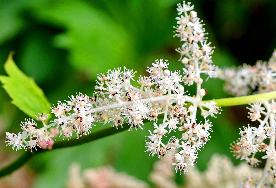 꽃은 양성화로 6∼7월에 흰색으로 피며 원추꽃차례로 빽빽이 달린다.